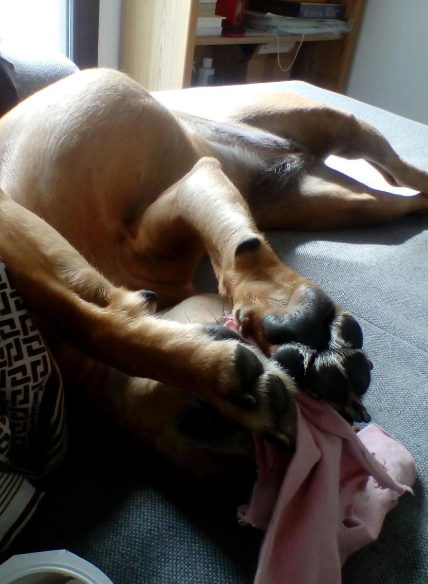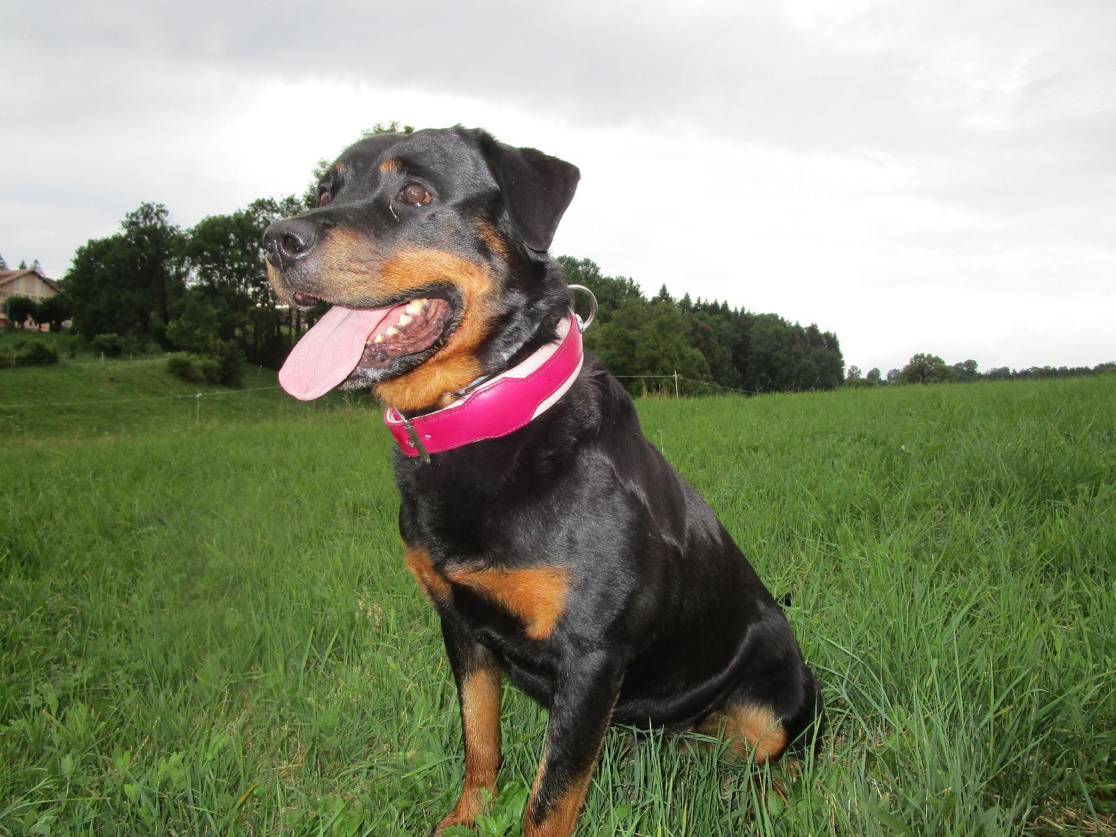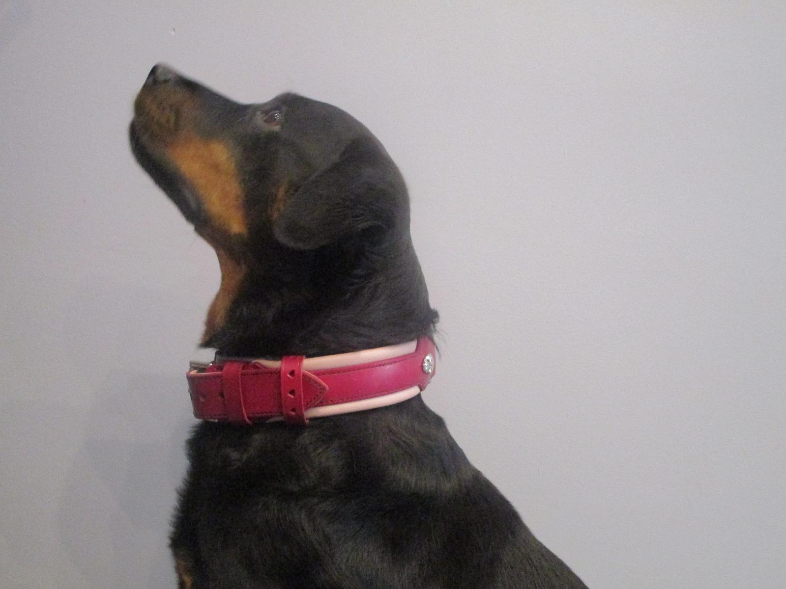 Une de nos mascotte. Elle est belle avec son nouveau collier. Merci à l'Atelier Napoléon pour son travail magnifique. Tia et son beau collier rose.